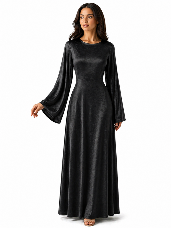 Robe longue fluide à la coupe cintrée, sublimée par un tissu satiné aux reflets doux. Son laçage au dos permet d’ajuster la taille pour une silhouette élégante et féminine. Manches évasées pour une touche de légèreté et de mouvement.
